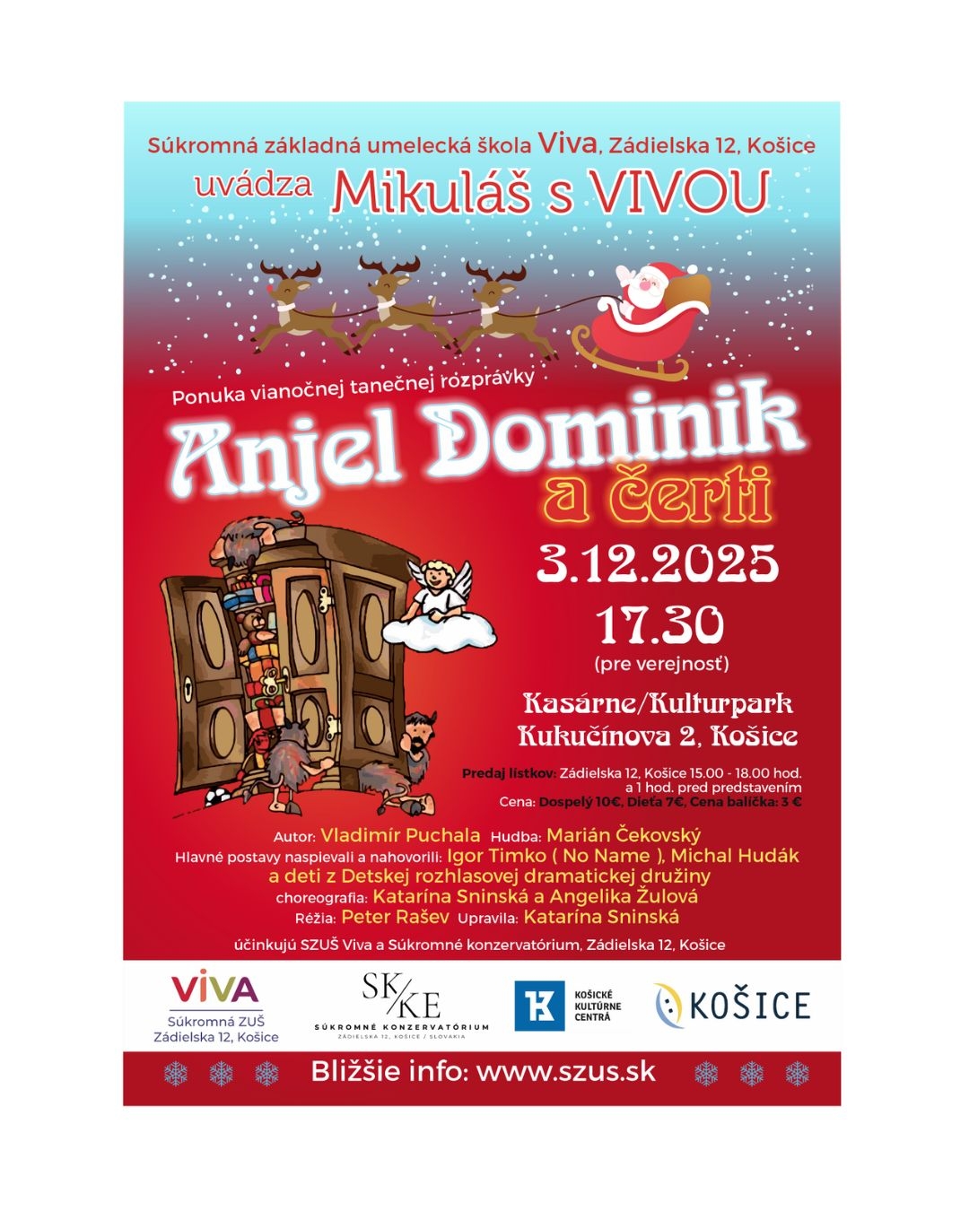 Srdečne vás pozývame na mikulášsku rozprávku Anjel Dominik a čerti. Kedy? 3. 12., 4. 12., 5. 12. 2025. Tešíme sa na Vás!